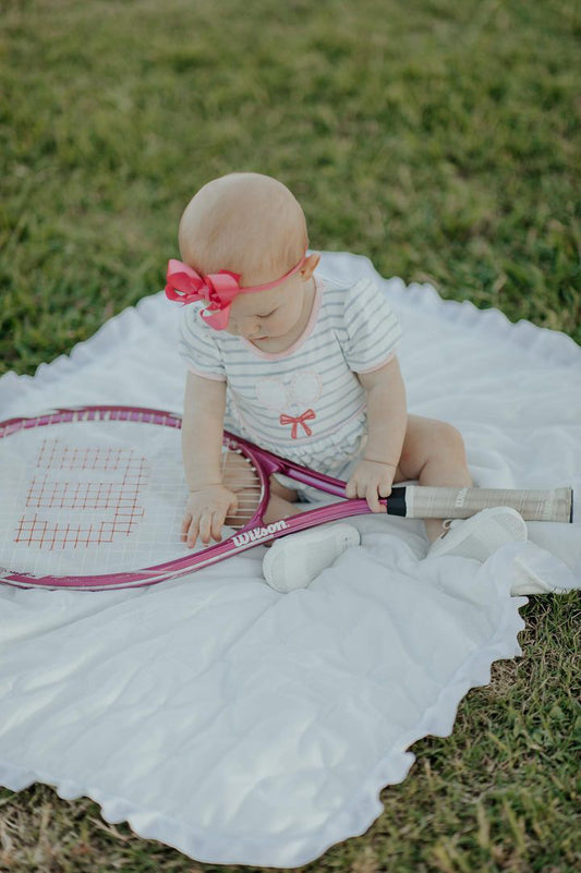 I ordered a 6M but it barely fit my 3 month old when it came in. He's in the 30th percentile for weight and height (14ish lbs when we tried it on), so he's not exceptionally big. Disappointed because I ordered it ahead of our Disney trip when he'll be 5 months and I don't think he'll be able to wear. The material is pretty cheap feeling and there is not a backing to the applique, so it seems uncomfortable on the baby's belly and chest. Ultimately, it's a cute bubble for a great price but you get what you pay for.